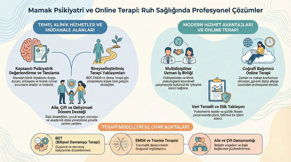 Modern yaşamın dinamikleri bireyler üzerinde çeşitli psikolojik etkiler yaratmakta. Artan bilişsel zorlamalar, psikolojik yük, duygusal düzensizlikler çeşitli sorunlara yol açmakta. Son yıllarda anksiyete, depresyon, sosyal işlevsellik eksiklikleri gibi sorunlar giderek yaygınlaşmakta. Dolayısıyla bireyin duygusal direncini ve yaşam kalitesini geliştiren çözümlere talep artmakta. Mamak psikiyatri hizmetleri ve online terapi desteği ile siz de bu çözümlerden yararlanabilirsiniz.