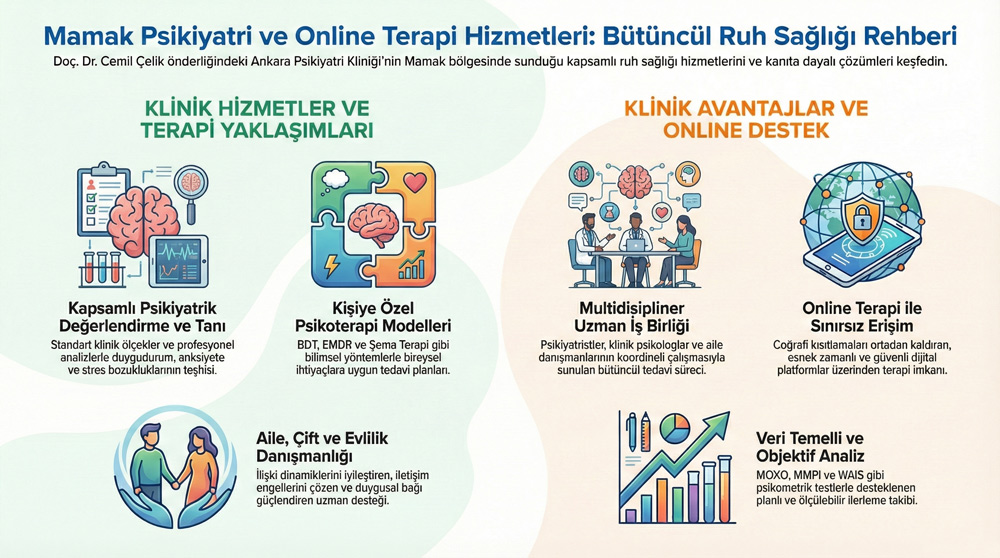 Ankara’nın Mamak ilçesi, ruh sağlığı alanında hizmet veren birçok klinik ve psikoterapi merkezine ev sahipliği yapmakta. Nitekim bölgede faaliyet gösteren psikiyatristler ve ruh sağlığı profesyonelleri tanı, izlem ve psikoterapi süreçlerinde etik ve bilimsel çerçevede ilerlemekte. Bireysel ihtiyaçlara uygun terapi planlamaları psikolojik sorunlara etkin çözüm yolları geliştirmekte.